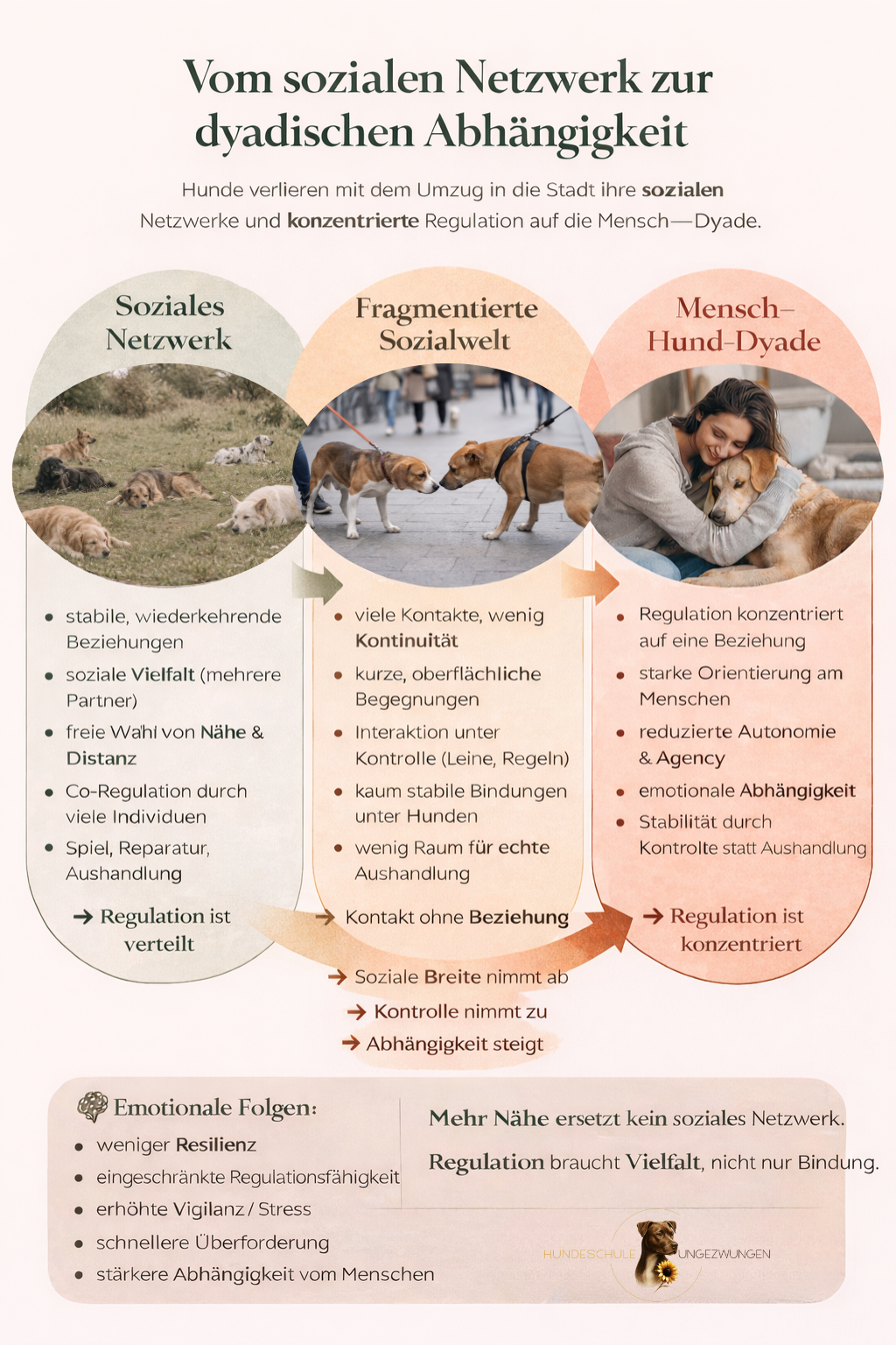 Die Autorinnen und Autoren beschreiben einen gesellschaftlichen Wandel. Im modernen westlichen Lebensumfeld schrumpfen soziale Netzwerke, und zwar nicht nur für Hunde, sondern auch für Menschen. Emotionale Regulation wird zunehmend in enge Beziehungen verlagert. Und in diesem Kontext werden Hunde zu zentralen Regulationspartnern. Sie strukturieren Alltagsrhythmen, schaffen körperliche Nähe, erleichtern niedrigschwellige soziale Kontakte im öffentlichen Raum.